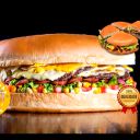 Delicioso Xis para 02 pessoas! Lanche contendo: pão de 20cm, alface, tomate, maionese especial, ketchup, hambúrguer de costela de 240g, 2 fatias de queijo, 2 ovos na chapa e tiras de bacon. Acompanha batatas fritas em volta do lanche.