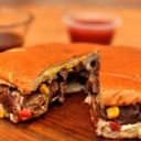 Pão de hambúrguer, maionese, alface, cubos de alcatra na chapa, ovo na chapa, fatia de queijo e tirinhas de bacon. Retirada na rua polonia, 69e Bairro Presidente Médice.